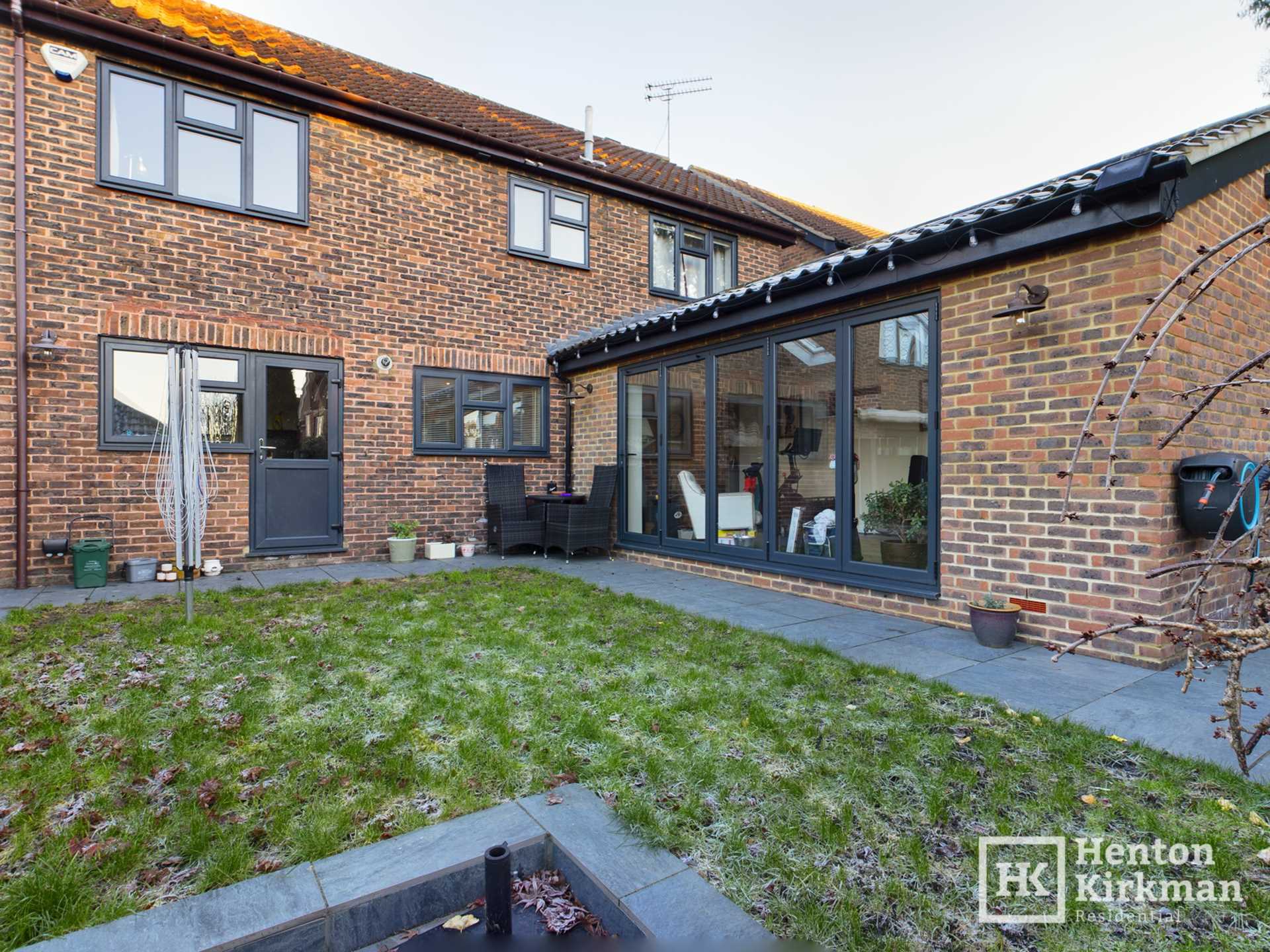 The small lawn is almost completely encircled by attractive slate paving, leading off to a feature Sunken Patio in the corner.