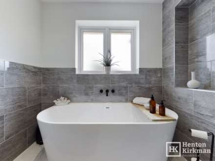 A blend of white marble and 'reclaimed wood' effect tiles, a tall chrome towel radiator, extractor fan and bathroom cabinet with lighting completes the very modern look and the wide rear facing window flask in lots of daylight.