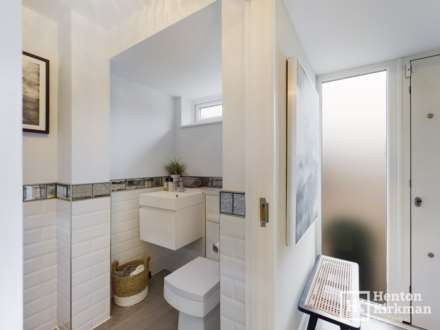 This particularly generous cloakroom is attractively tiled and has a close coupled pushbutton WC and wash basin with vanity storage under.