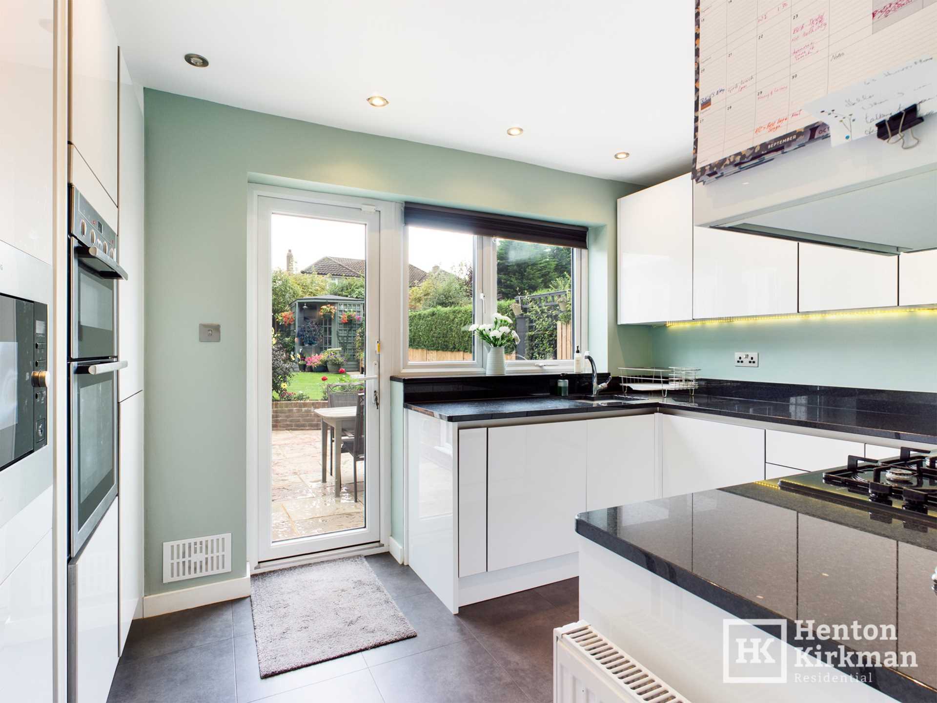 Accessed via a pocket door leading from the hall, the kitchen enjoys a window overlooking the rear garden and a door giving convenient access. Stylishly finished, this kitchen with a Amtico vinyl tiled floor, has a good range of gloss white base and wall units with granite worktops and upstands which incorporate a gas hob, dishwasher and sink unit.
