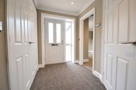 A spacious entrance area with a wall mounted wireless fully programmable room thermostat and a huge built in cupboard with fitted shelving and hanging space, also housing the MK consumer unit.