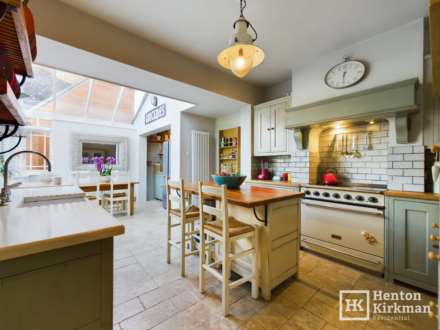 Homely and charming the Country Kitchen is open plan to a beautiful 'Orangery' style Breakfasting/Informal Dining Area, which has a set of double doors opening out to resin bonded, glass fronted Terrace, which looks down over Garden - lovely.